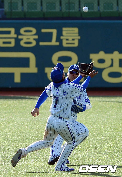 7일 오후 대구구장에서 열린 '2013 한국야쿠르트 세븐 프로야구' 삼성 라이온즈와 NC 다이노스의 경기 8회초 무사 만루 조평호의 뜬공을 김상수가 잡고 있다.