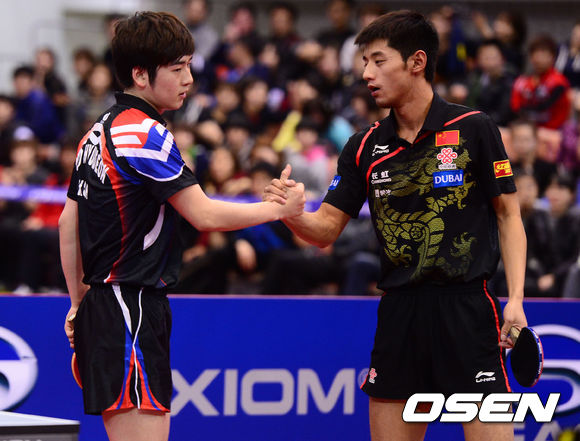 7일 오후 인천광역시 연수구 송도글로벌대학에서 '2013 대한항공 2013 코리아오픈 국제탁구대회' 남자복식 결승전, 이정우-마룽조 와 서현덕-장지커의 경기가 열렸다. 서현덕 장지커 조가 세트스코어 3-2(11-8 7-11 11-8 7-11 11-8)로 우승을 차지했다.