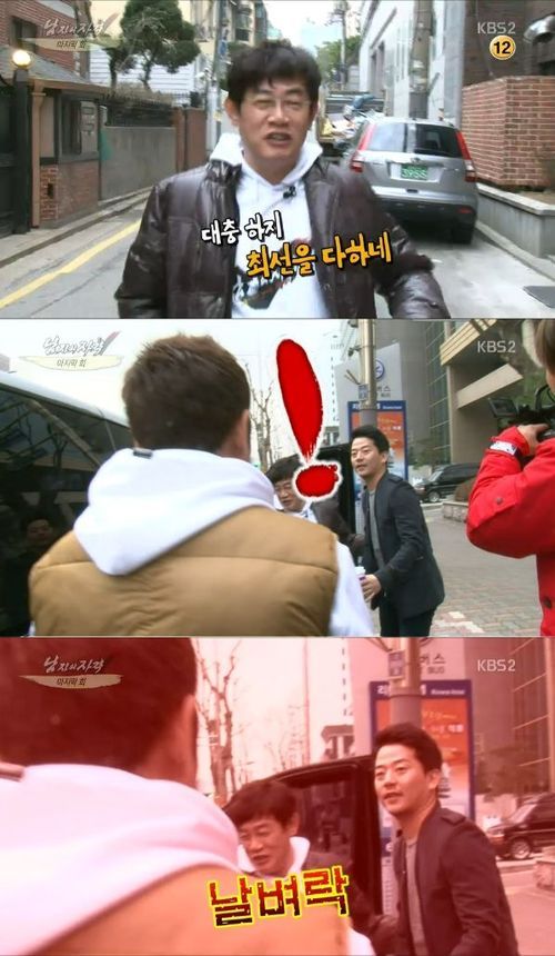 김준호는 7일 오후 방송된 KBS 2TV '해피선데이-남자의 자격'(이하 '남격')에서 차를 타고 길에서 기다리고 있던 자신을 태우러 온 이경규를 맞이했다.