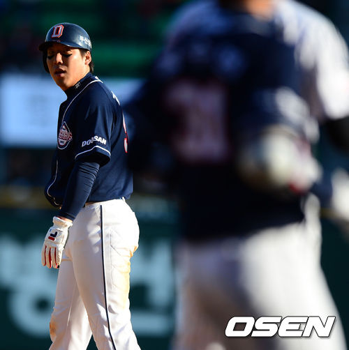 10회초 1사 1루에서 두산 김현수가 정수빈의 타구에 맞고 아웃되자 아쉬운 표정을 짓고 있다.