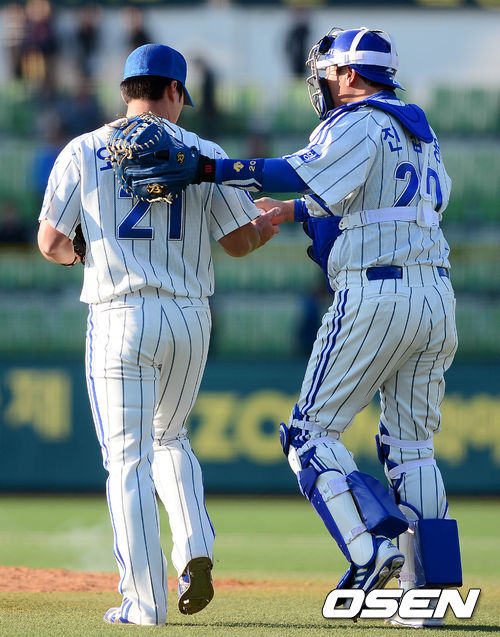7일 오후 대구구장에서 열린 '2013 한국야쿠르트 세븐 프로야구' 삼성 라이온즈와 NC 다이노스의 경기 종료 후 진갑용이 오승환을 격려하고 있다.