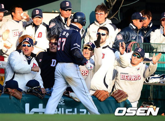 11회초 2사 3루에서 두산 오재원이 허경민의 내야땅볼에 홈을 밟고 역전에 성공, 더그아웃에서 동료선수들과 하이파이브를 하고 있다.