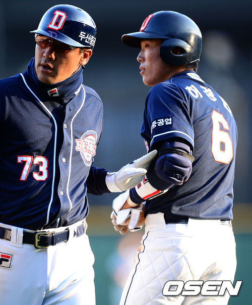 11회초 2사 3루에서 두산 허경민이 유격수 땅볼에 헤드퍼스트 슬라이딩으로 세이프 되며 역전타를 날리고 기뻐하고 있다.