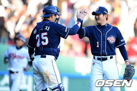 경기후 두산 양의지, 이재우가 승리 하이파이브를 하고 있다./jpnews@osen.co.kr