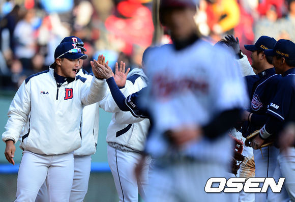 두산은 7일 잠실구장에서 열린 ‘2013 한국야쿠르트 세븐 프로야구’ 시즌 두 번째 맞대결에서 연장접전 끝에 6-5로 승리, 양 팀은 올 시즌 두 번의 맞대결서 1승 1패 동률을 이뤘다.