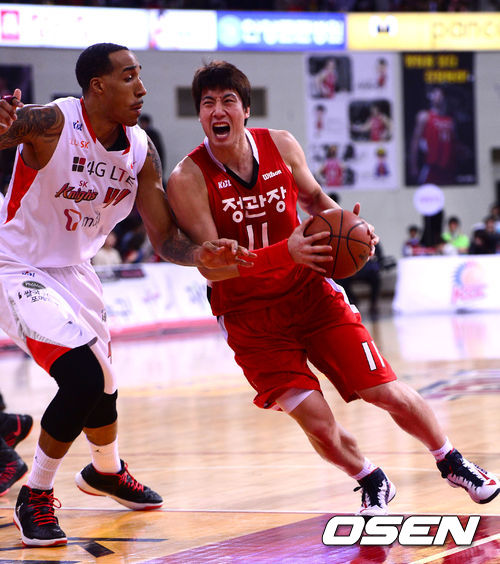 1쿼터, KGC 양희종이 SK 심스의 수비를 피해 드리블 돌파를 시도하고 있다.