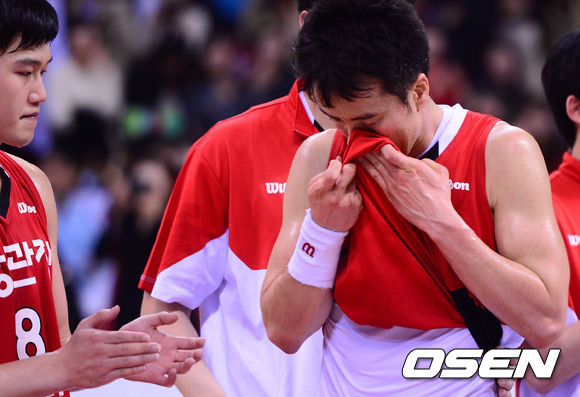 이번 시즌을 끝으로 지도자의 길을 걸을 예정인 KGC 김성철이 팬들에게 인사말을 마친 뒤 유니폼으로 얼굴을 닦고 있다./ dreamer@osen.co.kr