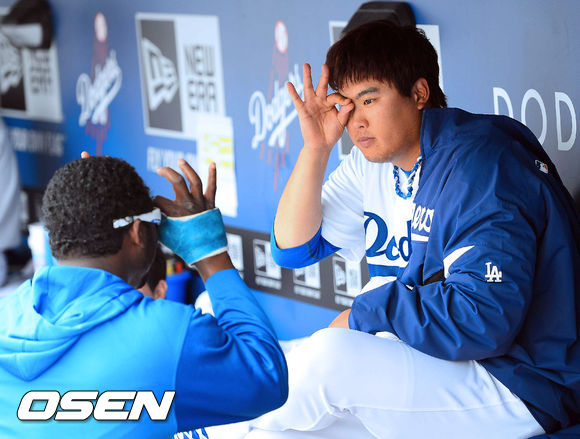 8일 새벽(이하 한국시간) 미국 캘리포니아 로스앤젤레스 다저스타디움에서 열린 LA 다저스와 피츠버그 파이어리츠와의 3차전 경기 전 류현진과 동료들과 장난을 치고 있다