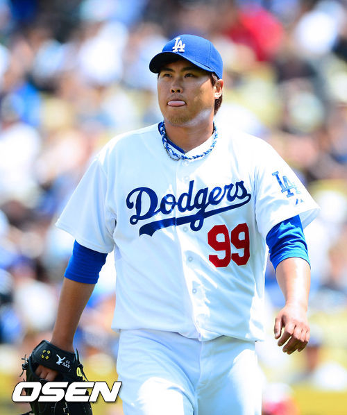 8일 새벽(이하 한국시간) 미국 캘리포니아 로스앤젤레스 다저스타디움에서 열린 LA 다저스와 피츠버그 파이어리츠와의 3차전, 1회초 이닝 종료 후 류현진이 아쉬운 듯한 표정으로 더그아웃 들어가고 있다