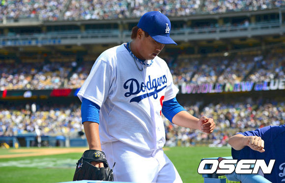 8일 새벽(이하 한국시간) 미국 캘리포니아 로스앤젤레스 다저스타디움에서 열린 LA 다저스와 피츠버그 파이어리츠와의 3차전 경기, 5회초 이닝 종료 후 류현진이 더그아웃으로 들어가고 있다