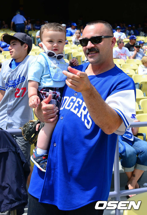 8일 새벽(이하 한국시간) 미국 캘리포니아 로스앤젤레스 다저스타디움에서 열린 LA 다저스와 피츠버그 파이어리츠와의 3차전 경기, 한 야구팬 가족이 카메라를 향해 포즈를 취하고 있다