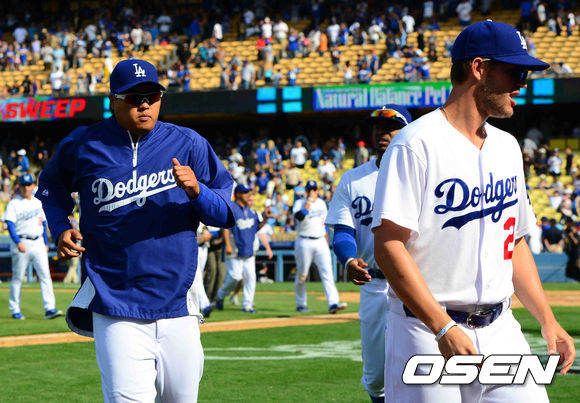 경기종료 후 선발 첫승을 거둔 류현진이 동료들을 환영한 뒤 더그아웃으로 들어가고 있다./rumi@osen.co.kr
