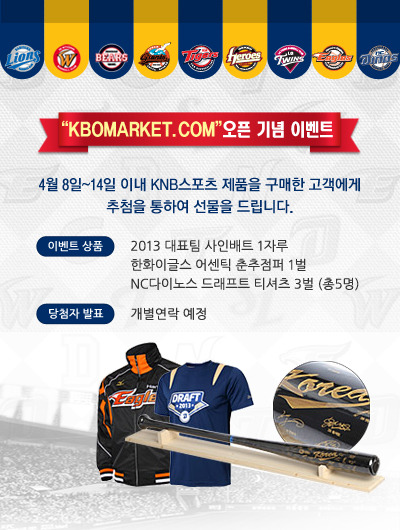 한국야구위원회(KBO)는 'www.kbomarket.com' 오픈 기념 이벤트로 'www.kbomarket.com'을 통해 KNB스포츠 제품을 구매하는 고객에게 추첨을 통해 2013 야구 대표팀 기념 사인 배트 1자루와 한화 이글스 어센틱 춘추점퍼 1벌, NC 다이노스 드래프트 티셔츠 3벌을 증정할 계획이다.