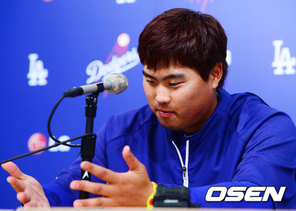류현진이 경기 종료 후 기자회견에서 자신의 손을 뿌듯한 표정으로 바라보고 있다. /rumi@osen.co.kr