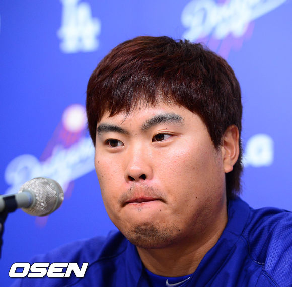 류현진이 경기 종료 후 기자회견에서 입술을 깨물고 있다. /rumi@osen.co.kr