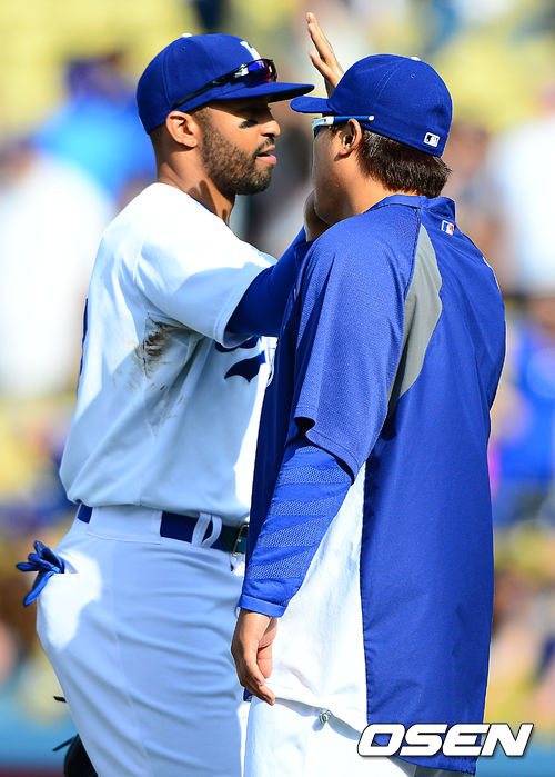 경기를 마치고 결승 희생타를 친 맷 켐프와 류현진이 하이파이브를 하고 있다. /rumi@osen.co.kr