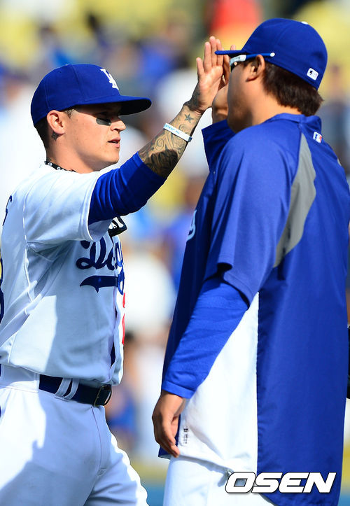 경기를 마치고 다저스 류현진이 쐐기포를 날린 셀러스와 하이파이브를 하고 있다. /rumi@osen.co.kr