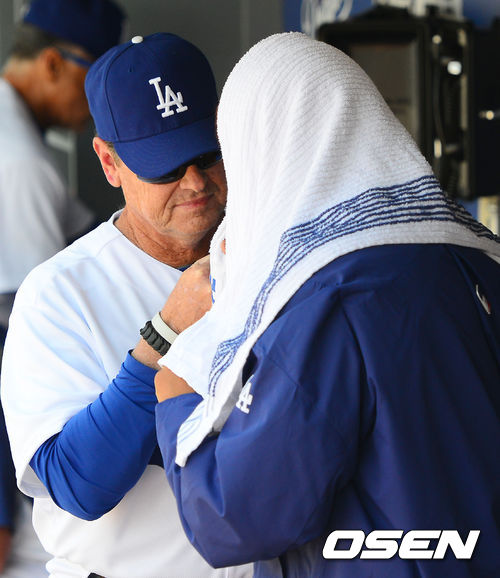 7회 마운드를 내려온 류현진과 릭 허니컷 코치와 하이파이브를 하고 있다. / rumi@osen.co.kr