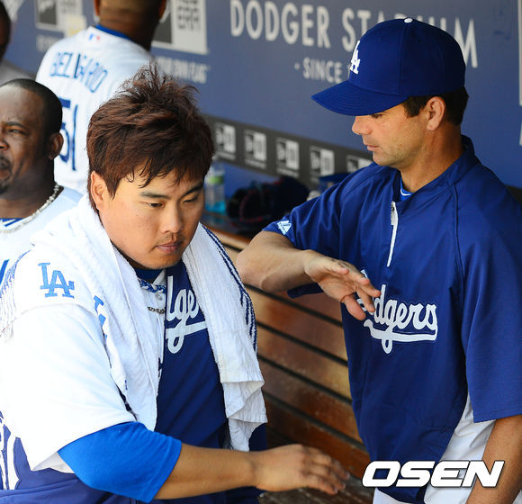 7회 마운드를 내려온 류현진이 덕아웃에서 투수 테드 릴리와 하이파이브를 하고 있다. / rumi@osen.co.kr