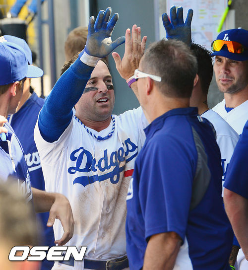 7회말 2사 1,2루 다저스 곤살레스의 1타점 적시타때 홈을 밟은 닉 푼토가 덕아웃에서 동료들과 하이파이브를 하고 있다. / rumi@osen.co.kr