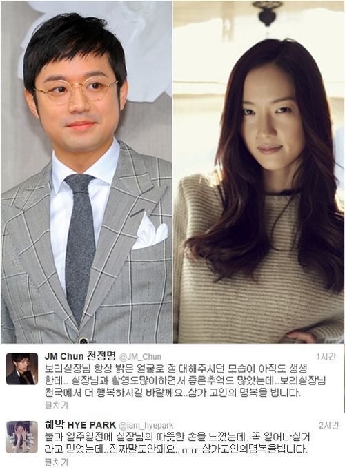 이어 혜박 역시 같은 날 자신의 트위터에 "불과 일주일 전에 실장님의 따뜻한 손을 느꼈는데 꼭 일어나실 거라고 믿었는데 진짜 말도 안돼요. 삼가 고인의 명복을 빕니다"라며 글을 올렸다. 또한 그는 "좋은 곳으로 가시길 기도할게요"라고 인사를 덧붙였다.