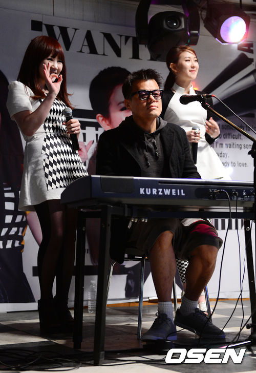 소녀듀오 피프틴앤드(15&, 박지민·백예린)가 8일 밤 서울 강남역 M스테이지에서 게릴라 콘서트를 열었다. 가수 박진영이 함께 무대에 올라 멋진 공연을 선보이고 있다.