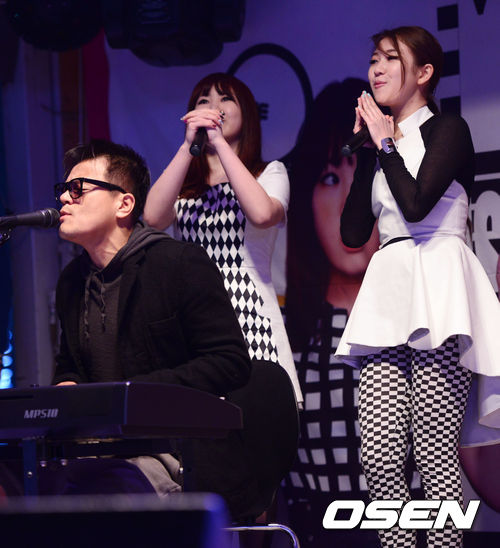 소녀듀오 피프틴앤드(15&, 박지민·백예린)가 8일 밤 서울 강남역 M스테이지에서 게릴라 콘서트를 열었다. 가수 박진영이 함께 무대에 올라 멋진 공연을 선보이고 있다.
