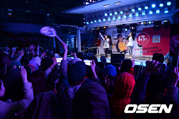 소녀듀오 피프틴앤드(15&, 박지민·백예린)가 8일 밤 서울 강남역 M스테이지에서 게릴라 콘서트를 열었다. 피프틴앤드가 팬들과 함께 멋진 공연을 선보이고 있다.