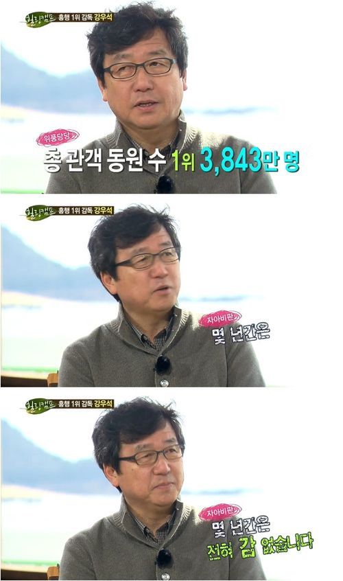 강우석 감독은 8일 방송된 SBS 토크쇼 ‘힐링캠프, 기쁘지 아니한가’에서 3800만명의 관객을 끌어모으며 흥행감독 1위에 올라선 것에 대해 “과거에는 흥행감독으로 인정했는데 요 몇 년 간 감이 전혀 없다”고 솔직하게 말했다.