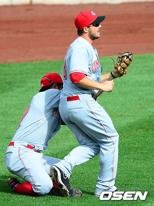 2회말 1사 세인트 루이스의 코즈마의 플라이타구를 신시내티 레즈 좌익수 크리스 헤이시와 중견수 추신수가 잡으려 하다. 추신수가 하이시와 충돌하며 넘어지고 있다. / rumi@osen.co.kr