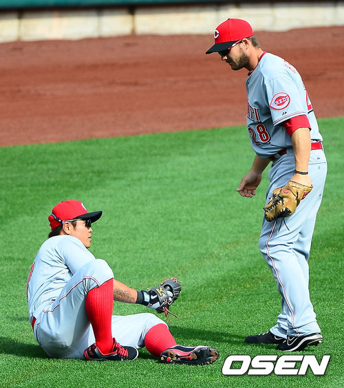 2회말 1사 세인트 루이스의 코즈마의 플라이타구를 신시내티 레즈 좌익수 크리스 하이시와 중견수 추신수가 잡으려 하다. 추신수가 하이시와 충돌하며 넘어졌다. 하이시가 추신수의 상태를 살피고 있다./ rumi@osen.co.kr