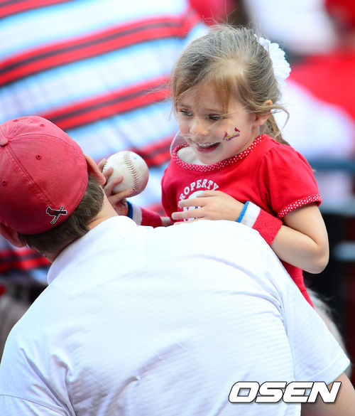 세인트루이스의 야구팬이 파울볼을 주워서 딸에게 주자 딸이 좋아하고 있다. / rumi@osen.co.kr