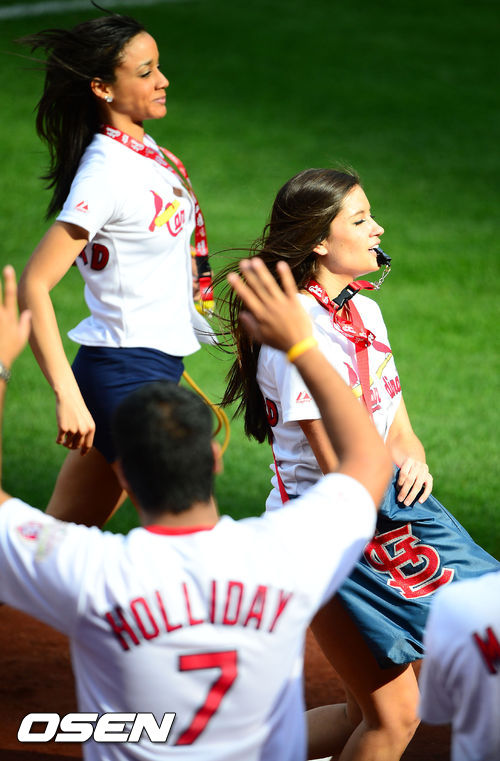 세인트 루이스 치어리더들이 호루라기를 불며 응원을 펼치고 있다. / rumi@osen.co.kr