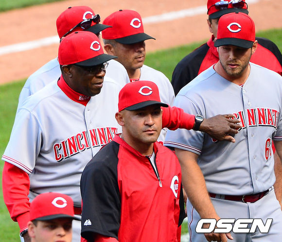 경기를 마치고 신시네티 더스티 베이커 감독이 마무리 투수 J.J 후버를 격려하고 있다. / rumi@osen.co.kr