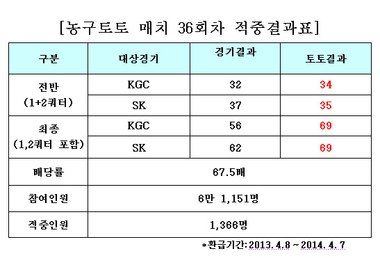 4강 플레이오프 4차전 KGC-SK전 대상 농구토토 매치 36회차 1366명 적중