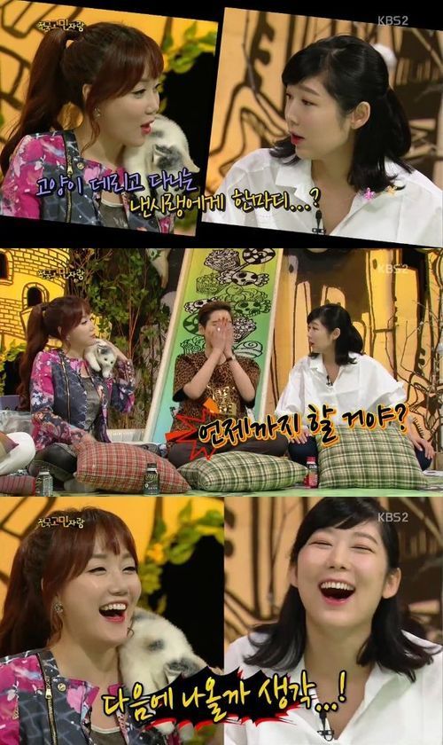 사유리는 8일 방송된 KBS 2TV 예능프로그램 '안녕하세요'에서 이같이 말하며 "(코코샤넬을) 어디에서 샀냐"고 물었다. 이에 낸시랭은 "난 얘를 사랑한다"며 코코샤넬을 쓰다듬었고, 이후에도 두 사람의 엉뚱한 대화는 계속됐다.