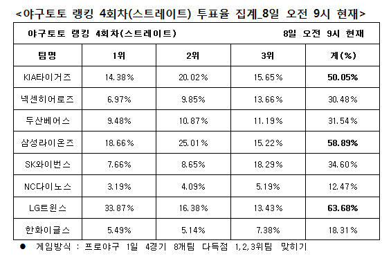 국민체육진흥공단(www.kspo.or.kr)이 발행하는 체육진흥투표권 수탁사업자인 스포츠토토 공식발매사이트인 베트맨(www.betman.co.kr)은 9일 개최되는 LG-NC, SK-넥센, 삼성-한화, KIA-두산 등 4경기 8개팀을 대상으로 한 야구토토 랭킹 4회차 스트레이트 게임 중간집계결과 LG(63.38%), 삼성(58.89%), KIA(50.05%)을 차례로 다득점 상위 3개팀으로 꼽았다고 밝혔다. 반면 한화와 NC는 각각 18.31%와 12.47%를 득표해 가장 적은 득점을 기록할 것으로 예상했다.