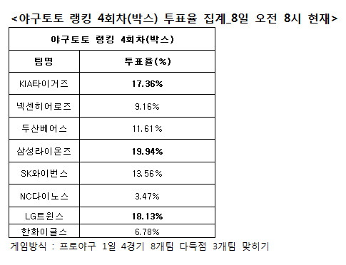 한편, 순위에 상관없이 다득점 3개팀만을 맞히는 '박스' 게임에서는 삼성(19.94%), LG(18.13%), KIA(17.36%)이 가장 많은 득점을 기록할 것으로 집계됐다. 최소득점에서는 한화와 NC가 각각 6.78%와 3.47%로 빈곤한 득점력을 보일 것으로 전망됐다.