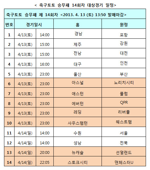 이밖에 아스널-노리치시티(6경기), 레딩-리버풀(9경기)전 등이 대상경기로 선정됐다. 축구토토 승무패 14회차 게임은 오는 13일 오후 1시 50분에 발매가 마감된다.
