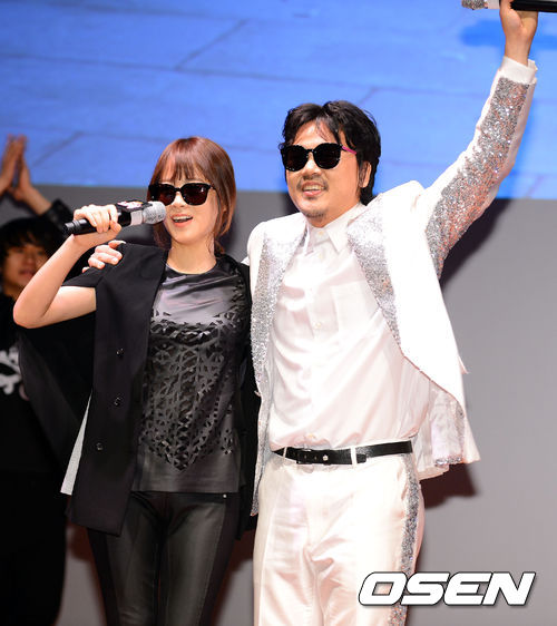 9일 오전 서울 건대 롯데시네마에서 열린 '전국노래자랑' (이종필 감독) 제작발표회에서 류현경과 김인권이 OST무대를 선보이고 있다.