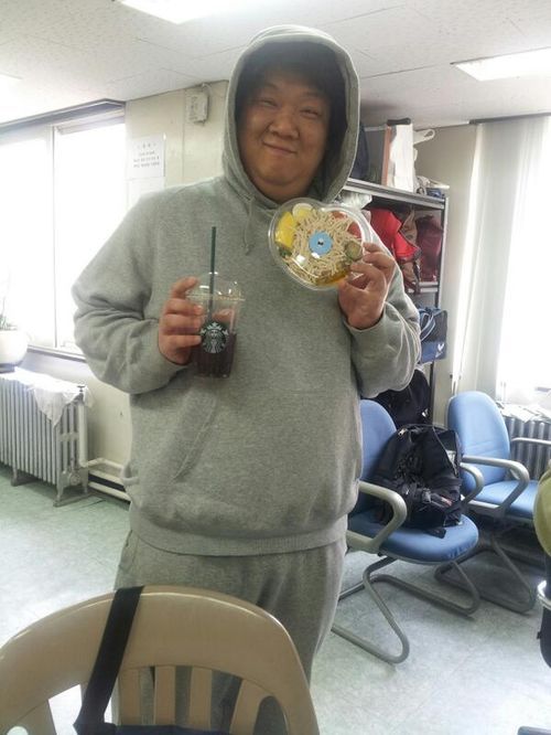 공개된 사진 속 유민상은 커다란 벤티 사이즈 커피와 닭가슴살 샐러드가 담긴 도시락을 들고 카메라를 응시하고 있다. 그의 커다란 몸 덕분에 벤티 사이즈 커피가 너무나 작아 보여 눈길을 끈다.