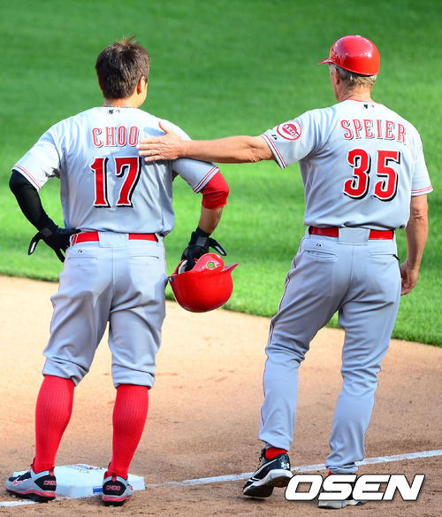 7회초 2사 1,2루 신시내티 헤이시 좌익선상 1타점 2루타때 3루에 세이프한 추신수에게 스피어 주루코치가 추신수의 등을 어루만지고 있다. / rumi@osen.co.kr
