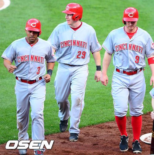 9회초 1사 주자 만루 신시내티 레즈 추신수가 좌전 3타점 싹쓸이 적시타때 이스투리스 해니건 해너핸이 홈을 밟고 있다. / rumi@osen.co.kr