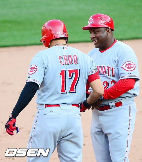 9회초 1사 주자 만루 신시내티 레즈 추신수가 좌전 3타점 싹쓸이 적시타를 날린 후 2루에서 . 빌리 해처 코치의 축하를 받고 있다./ rumi@osen.co.kr
