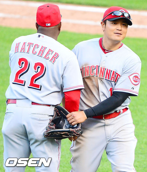 경기를 마치고 신시내티 추신수가 빌리 해처 코치와 승리의 기쁨을 나누고 있다./ rumi@osen.co.kr