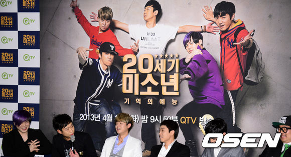 9일 오후 서울 삼성동 메가박스 코엑스에서 열린 QTV '20세기 미소년' 제작발표회에서 문희준, 천명훈, 토니안, 은지원, 데니안이 기자회견을 하고 있다.