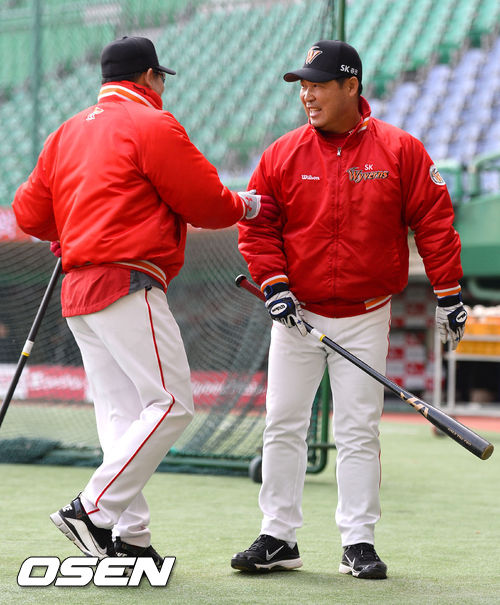 9일 오후 인천 문학구장에서 열리는 '2013 한국야쿠르트 세븐 프로야구' SK 와이번스와 넥센 히어로즈의 경기 전 SK 이광근 코치가 공 치우는 이만수 감독을 말리고 있다.