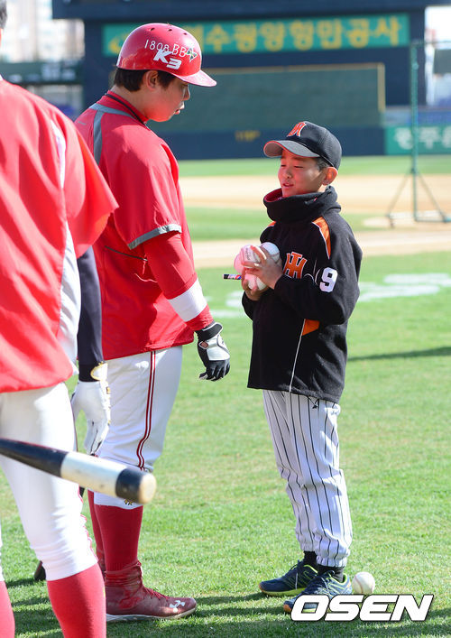 9일 오후 광주 무등경기장에서 열리는 '2013 한국야쿠르트 세븐 프로야구' KIA 타이거즈 대 두산 베어스의 경기를 앞두고 KIA 나지완이 어린 야구 선수팬과 대화를 나누고 있다.