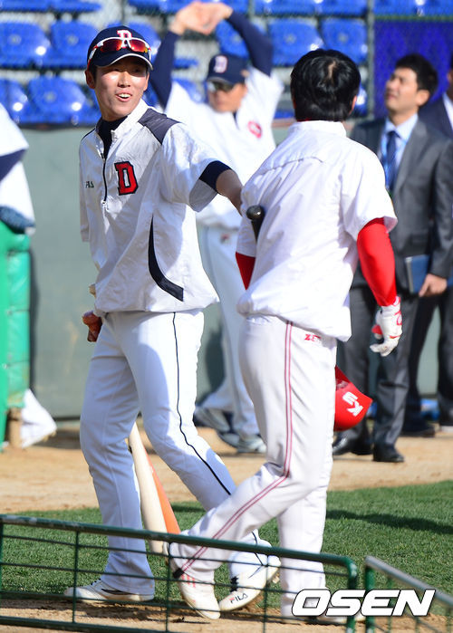 9일 오후 광주 무등경기장에서 열리는 '2013 한국야쿠르트 세븐 프로야구' KIA 타이거즈 대 두산 베어스의 경기를 앞두고 두산 허경민과 KIA 김선빈이 대화를 나누고 있다.