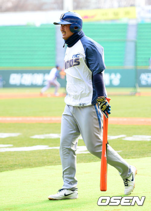 9일 오후 서울 잠실야구장에서 열린 2013 한국야쿠르트 세븐프로야구 LG 트윈스와 NC 다이노스의 경기, 경기에 앞서 NC 이호준이 타격 훈련을 마치고 덕아웃으로 가고 있다.